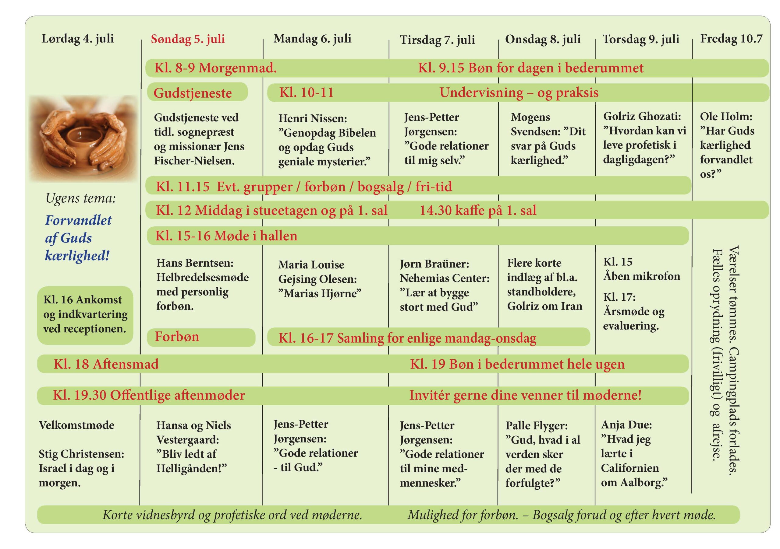 Kl. 19.30: Aftenmøde i hallen – begyndende med ca. ½ times lovsang. Tale kl. 20. Efter talen er der mulighed for personlig forbøn.